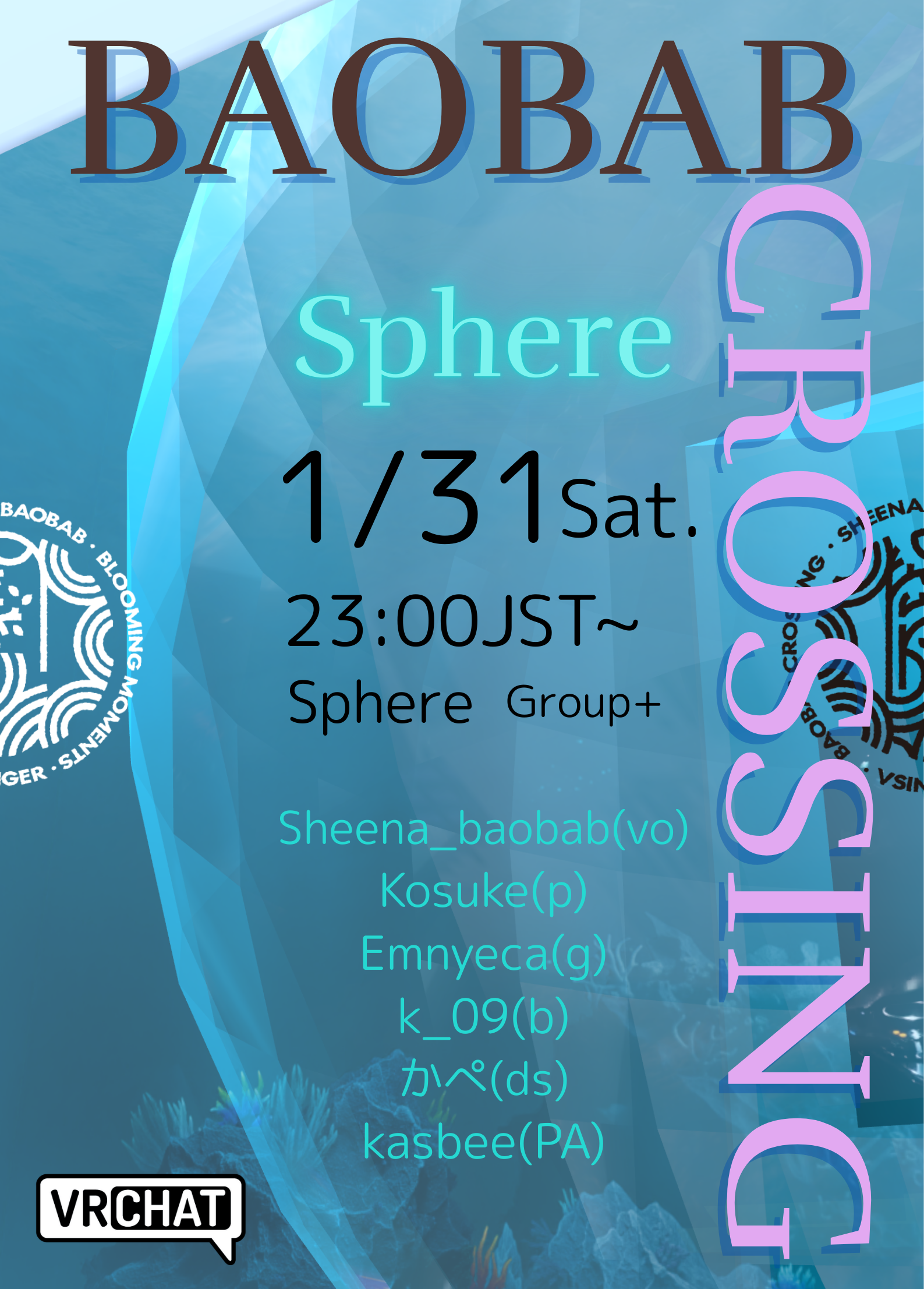 VRChatで新しく公開されるBar Sphereのオープニングライブで、SheenaさんのバンドBaobab Crossingとして出演します。