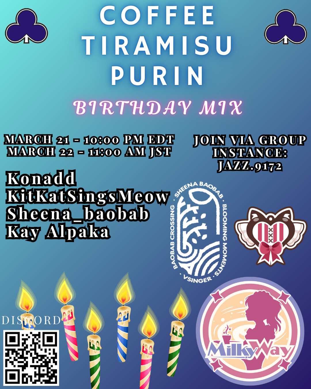 Coffee Tiramisu Purin: Birthday Mix is the shared birthday party for Kay Alpaka, Sheena_baobab, and Lanzor Roznal on 2026年3月22日 日曜日 11:00 🎂